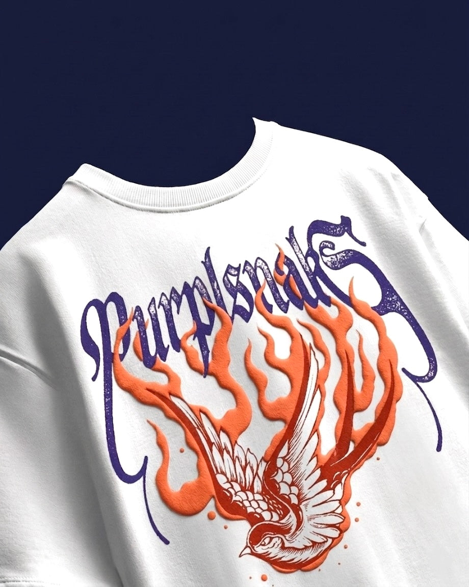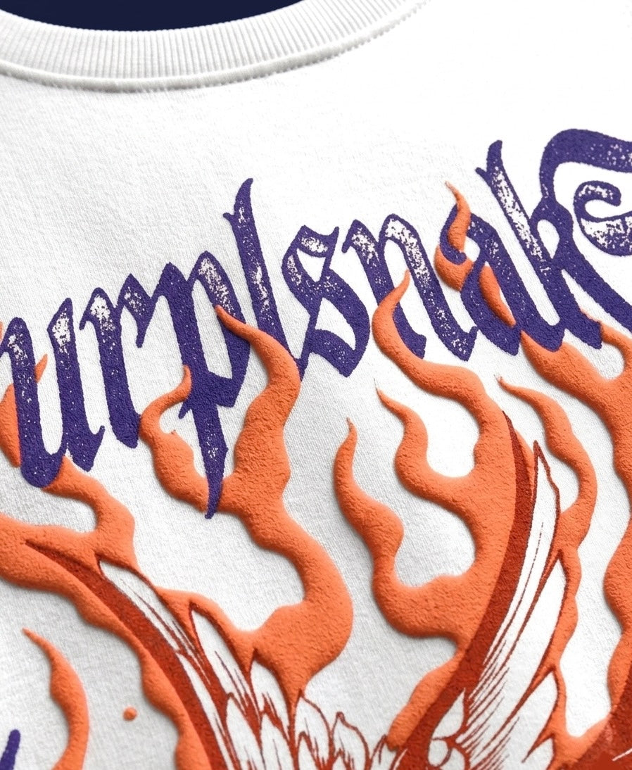 This piece draws from the mythic power of Garuda—reimagined through an infernal lens. Rising through blazing embers, the winged form symbolizes dominance, rebirth, and untamed energy.Crafted in heavyweight premium cotton with high-density print, every detail stands raised—like fire captured mid-motion.Not just a t-shirt.A relic of power.