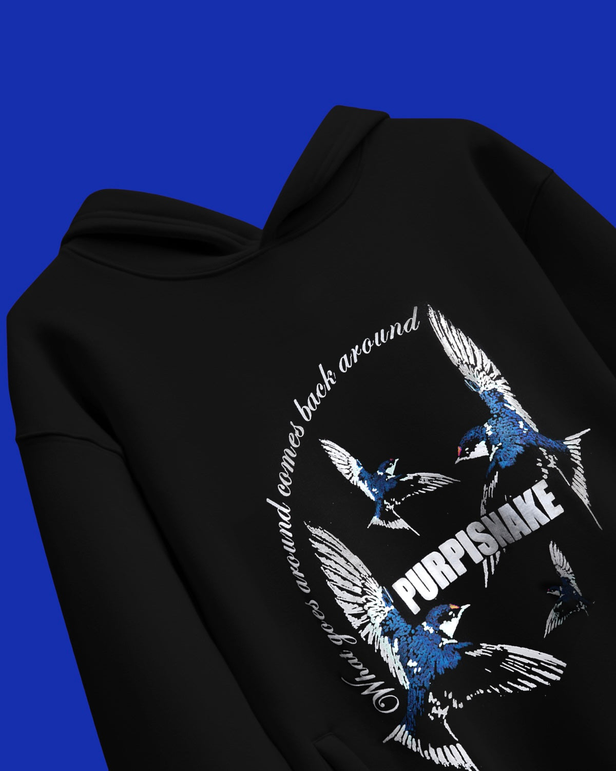 The Sky bound Blue hoodie design for Purplsnake brings a calm yet symbolic energy, merging minimalism with depth. Set on a clean base of black, the design features three stylized birds in flight, rendered in varying shades of blue to evoke a sense of freedom, fluidity, and movement.